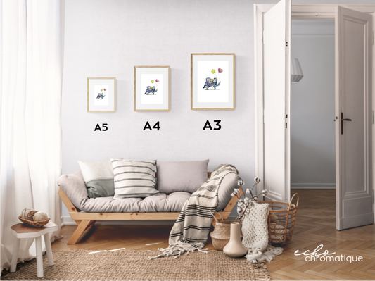 Tous les modèles proposés sont des impressions et vont du format A5 au format A3. Lorsque le modèle "original" est disponible il est proposé dans un format unique.