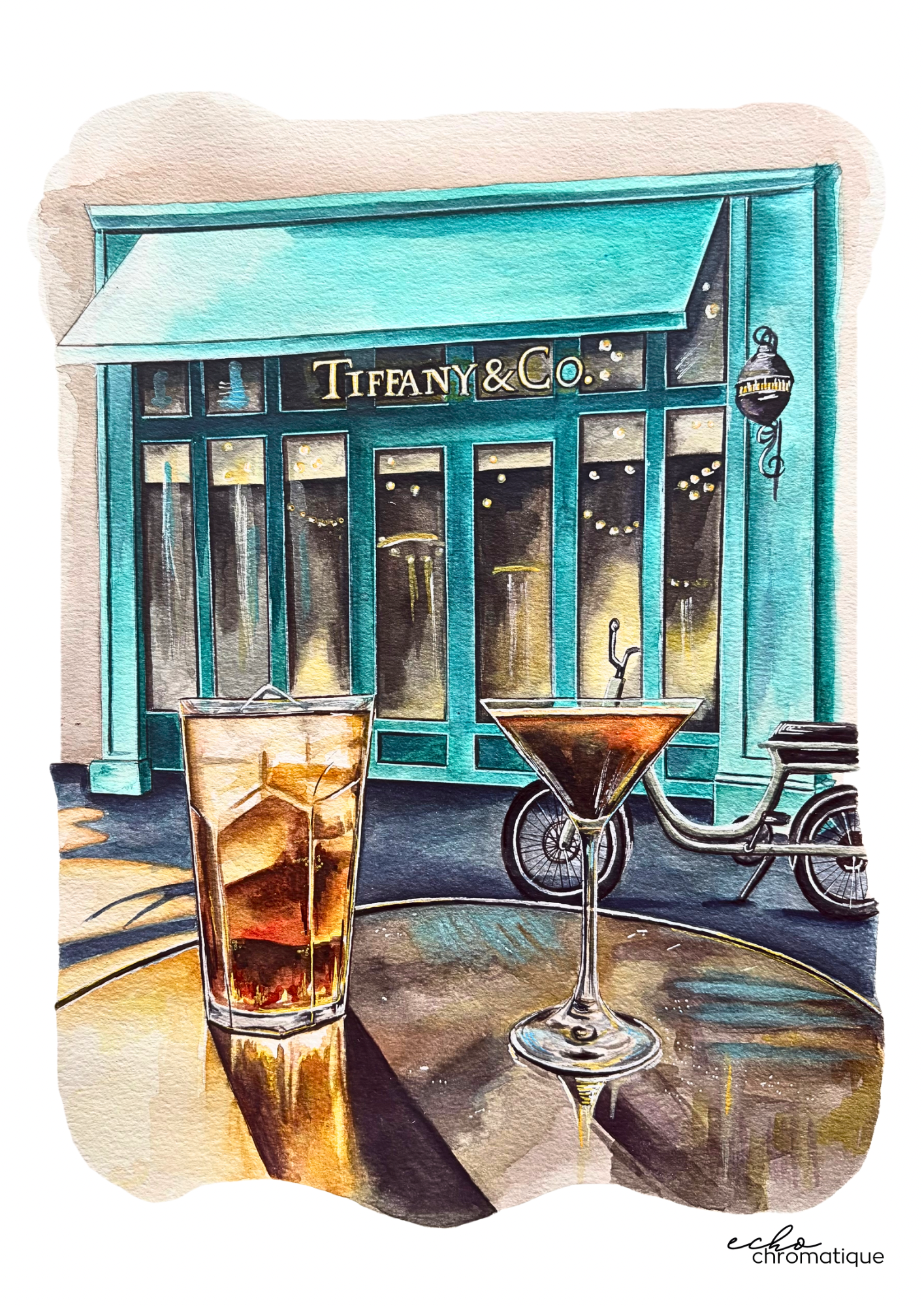 Leur cocktail préféré : un Long Island pour Max et un Espresso Martini pour Marie. La table du bistrot où ils ont l’habitude d’aller. Le vélo de Max garé en arrière plan. Et la devanture Tiffany’s, là où Max est allé cherché la bague de Marie pour lui faire une surprise.