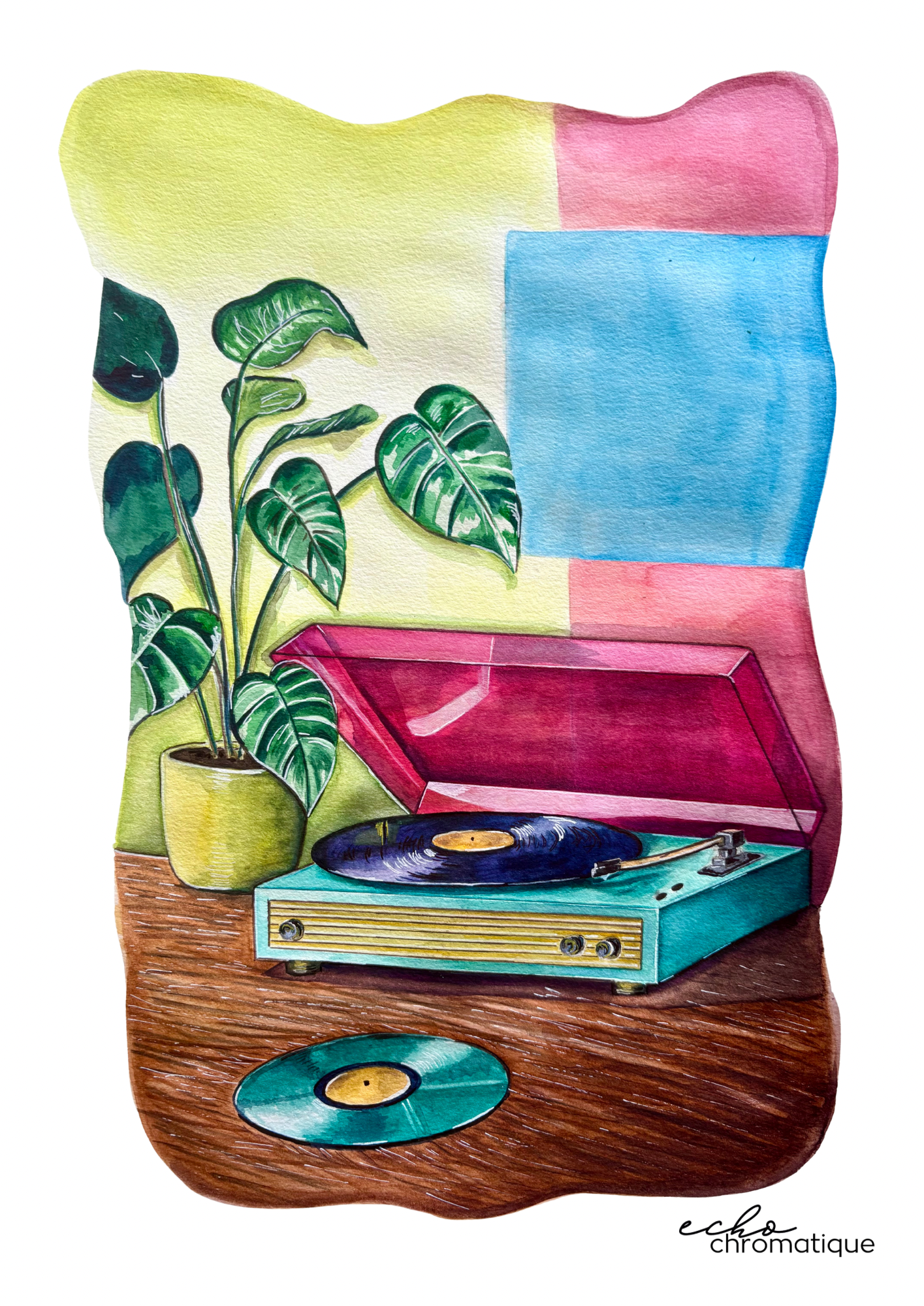 Une illustration surprise pour un passionné de musique et vendeur de vinyle. Le tout va servir à décorer la coin salon où est installé le tourne disque.